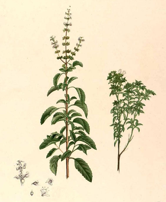 Habit and cultivation: Native to the Indian subcontinent, Holy basil now grows in most places in the world. Found in most traditional Hindu homes as a pot plant. Grows well in moist soil, with high rainfall and humid conditions. Grown from seed and harvested when in full bloom to obtain a maximum, high quality essential oil.